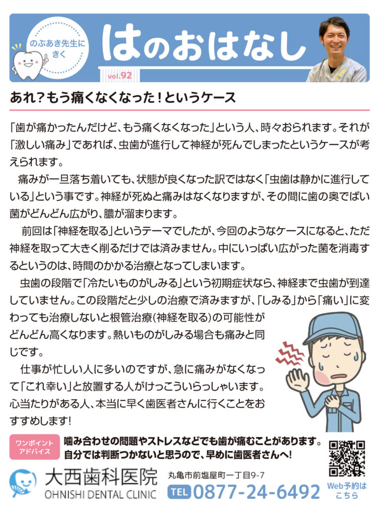 痛みが一旦落ち着いても、状態が良くなった訳ではなく「虫歯は静かに進行して いる」という事です。神経が死ぬと痛みはなくなりますが、その間に歯の奥でばい 菌がどんどん広がり、膿が溜まります。